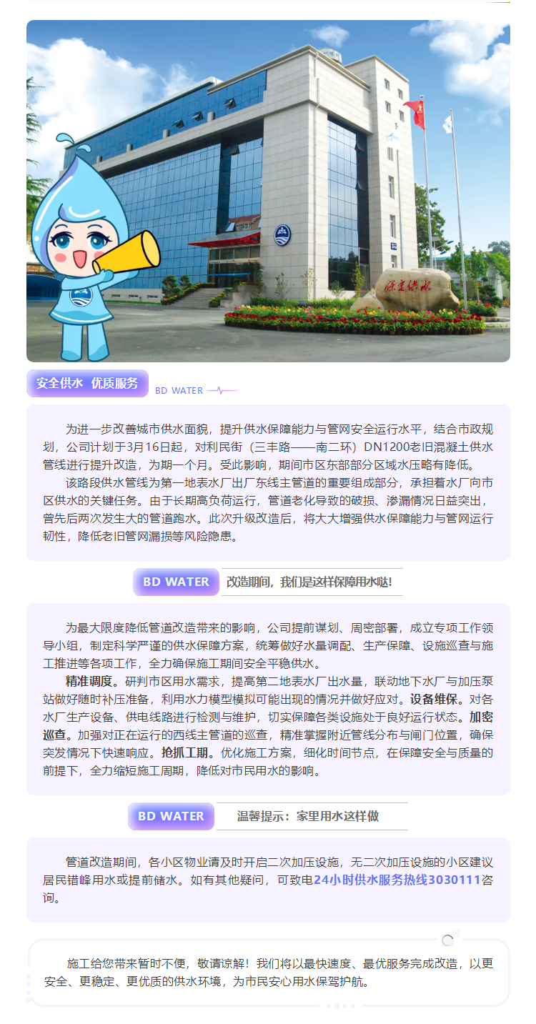 供水主管道升級改造!請注意用水變化